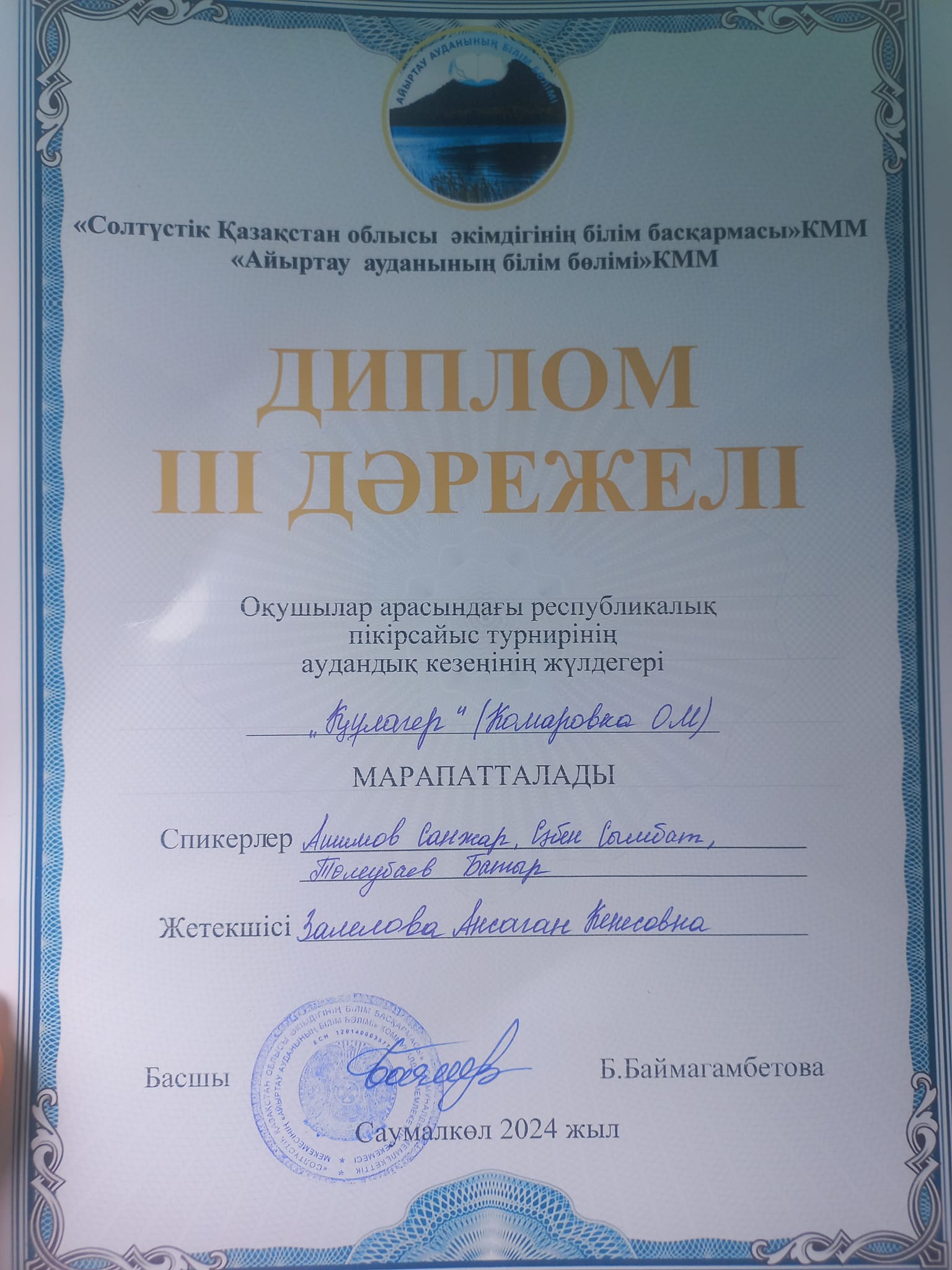 4 сентября учащиеся Комаровской неполной средней школы Ашимов Санжар, Сабен Сымбат, Толеубаев Батыр приняли участие в районном этапе республиканского дебатного турнира среди школьников и получили диплом III степени. Учащийся 8 класса Санжар Ашимов на эт